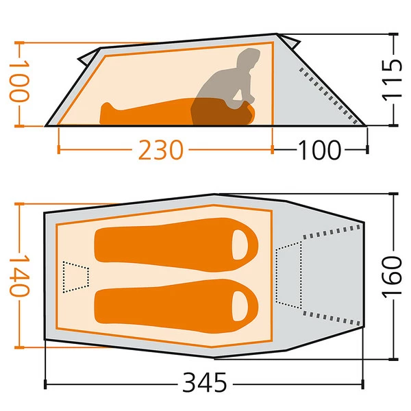 Das Zelt wird über die Apsis betreten, in der ausreichend Platz für Ausrüstungsgegenstände ist. Das Innenzelt ist mit 140 cm Breite großzügig geschnitten. Neben den Isomatten ist daher auch Platz, um weitere Ausrüstung im Zelt zu verstauen. In den beiden Netzseitentaschen finden Bücher, Stirnlampe oder GPS einen immer griffbereiten Platz.