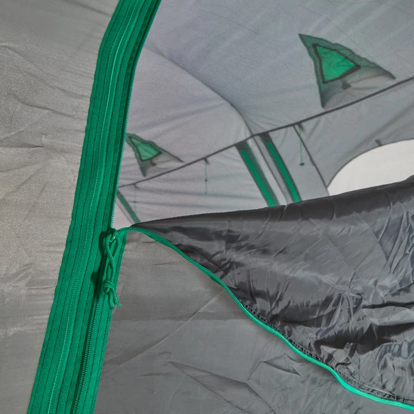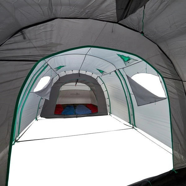 Werden beide Innenzelte ausgehängt, kann das verbleibende Überzelt als Zelt für z.B. Gartenpartys dienen. Vier Eingänge, die teilweise auch hochgestellt werden können, bieten nicht nur eine gute Aussicht, sondern mit den acht weiteren Lüftern auch eine optimale Raumbelüftung. Die Fenster stellen jedoch auch bei geschlossenen Eingängen eine gute Sicht nach draußen bereit.