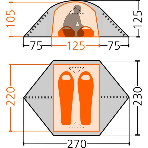 Das Innenzelt ist für zwei Personen großzügig geschnitten. Mit einer Höhe von 105 cm kannst du bequem sitzen und auch das Anziehen am Morgen ist ohne große Verrenkungen möglich. In den vier Seitentaschen lassen sich Bücher, Stirnlampe, Mobiltelefon u. Ä. griffbereit aufbewahren. Der Innenzelteingang ist mit einem Moskitonetz ausgestattet und kann bei Bedarf mit Stoff verschlossen werden. Damit du nicht jedes Mal den Eingang aufrollen musst, befinden sich zwei zusätzliche Netztaschen neben der Tür, in der sich die Türen unkompliziert verstauen lassen.
